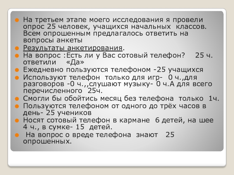 Слайд 15На третьем этапе моего исследования я провели опрос 25 человек, учащихся