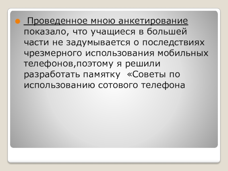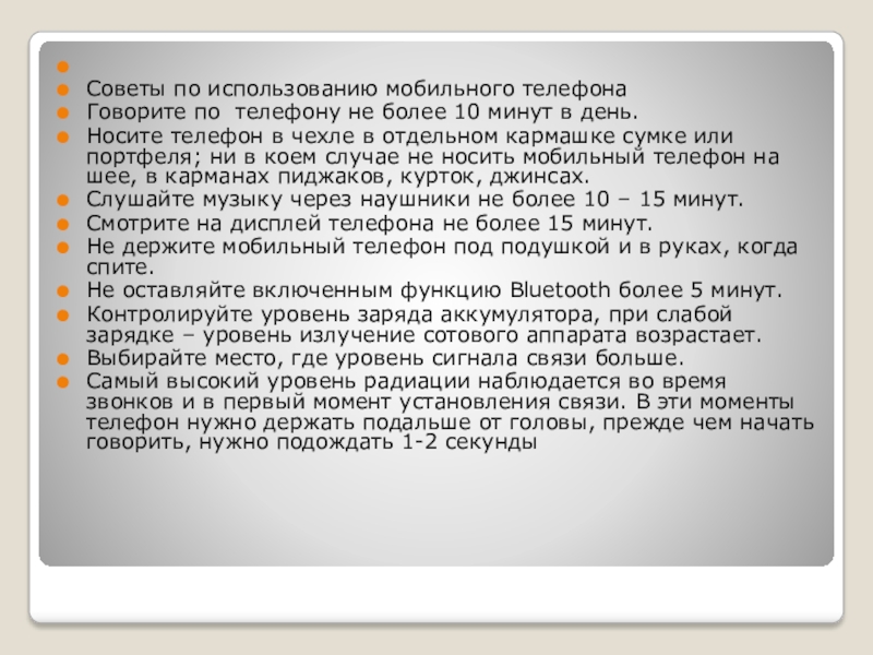 задумывается о последствиях чрезмерного использования мобильных телефонов,поэтому я решили разработать памятку «Советы по использованию сотового телефона