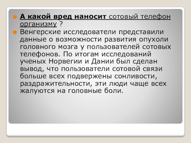 о возможности развития опухоли головного мозга у пользователей сотовых телефонов. По итогам исследований ученых Норвегии и Дании был сделан вывод, что пользователи сотовой связи больше всех подвержены сонливости, раздражительности, эти люди чаще всех жалуются на головные боли.