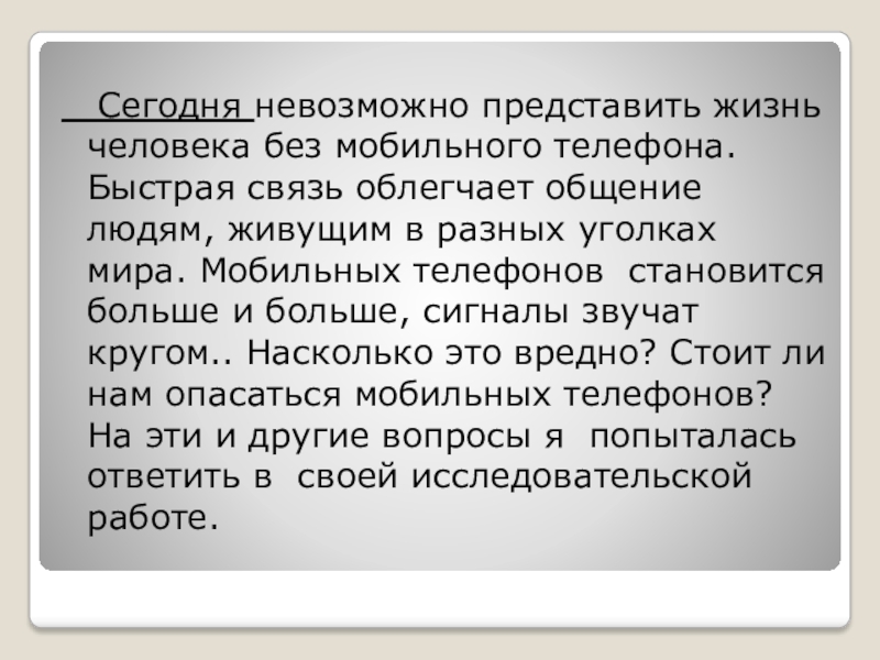 связь облегчает общение людям, живущим в разных уголках мира. Мобильных телефонов становится больше и больше, сигналы звучат кругом.. Насколько это вредно? Стоит ли нам опасаться мобильных телефонов? На эти и другие вопросы я попыталась ответить в своей исследовательской работе.