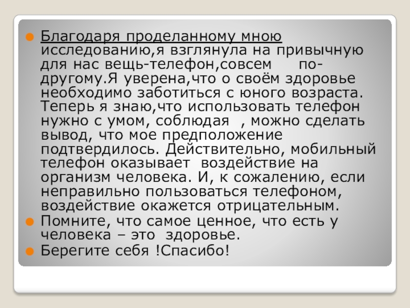 по-другому.Я уверена,что о своём здоровье необходимо заботиться с юного возраста.Теперь я знаю,что использовать телефон нужно с умом, соблюдая , можно сделать вывод, что мое предположение подтвердилось. Действительно, мобильный телефон оказывает воздействие на организм человека. И, к сожалению, если неправильно пользоваться телефоном, воздействие окажется отрицательным.