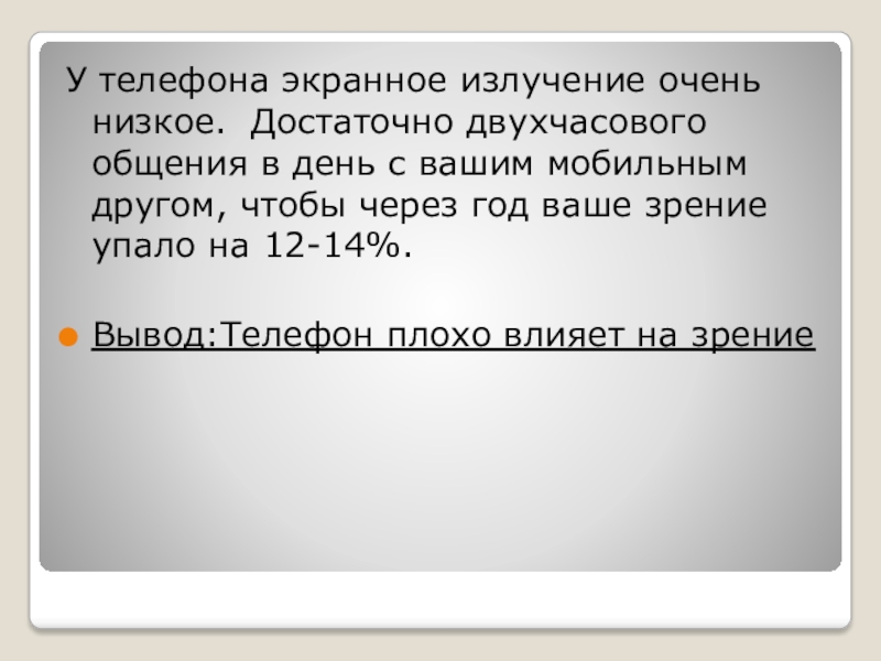 Слайд 11У телефона экранное излучение очень низкое. Достаточно двухчасового общения в день