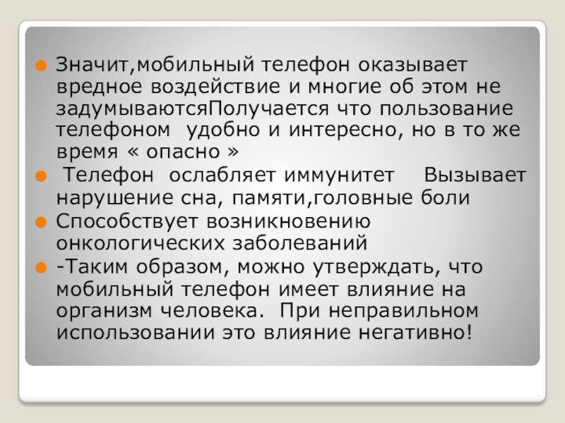 -Таким образом, можно утверждать, что мобильный телефон имеет влияние на организм человека. При неправильном использовании это влияние негативно!