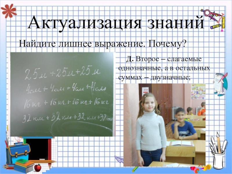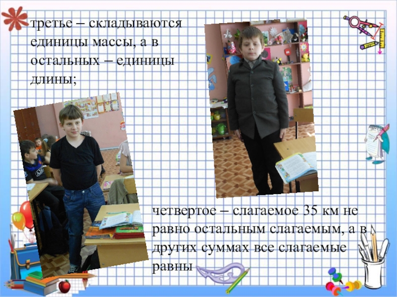 четвертое – слагаемое 35 км не равно остальным слагаемым, а в других суммах все слагаемые равны