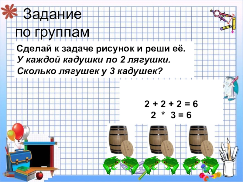 У каждой кадушки по 2 лягушки. Сколько лягушек у 3 кадушек?