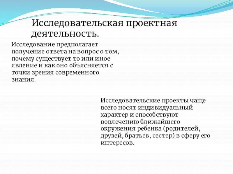 Исследовательские проекты чаще всего носят индивидуальный характер и способствуют вовлечению ближайшего окружения ребенка (родителей, друзей, братьев, сестер) в сферу его интересов.