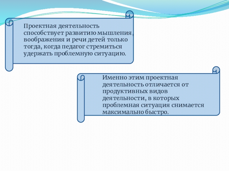 Именно этим проектная деятельность отличается от продуктивных видов деятельности, в которых проблемная ситуация снимается максимально быстро.