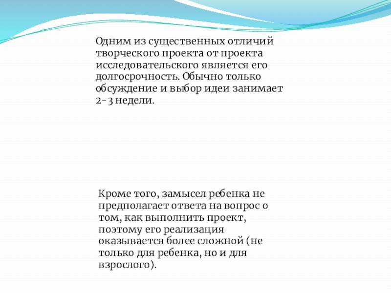 Кроме того, замысел ребенка не предполагает ответа на вопрос о том, как выполнить проект, поэтому его реализация оказывается более сложной (не только для ребенка, но и для взрослого).