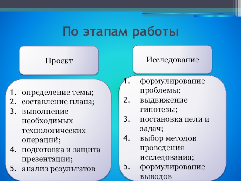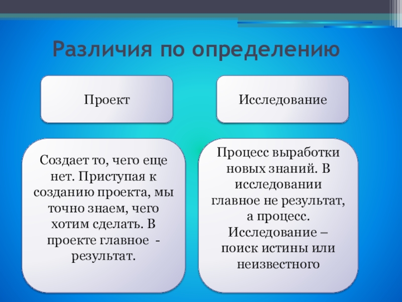 Процесс выработки новых знаний. В исследовании главное не результат, а процесс. Исследование – поиск истины или неизвестного