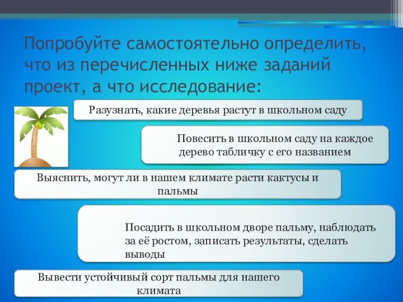 Посадить в школьном дворе пальму, наблюдать за её ростом, записать результаты, сделать выводы