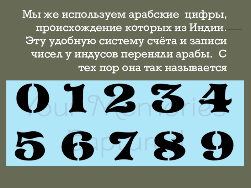 Слайд 9Мы же используем арабские цифры, происхождение которых из Индии. Эту удобную