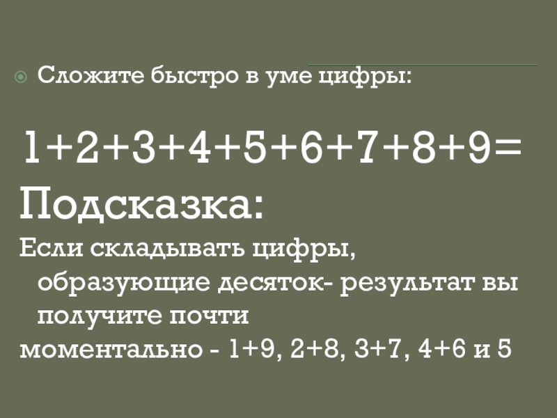 Слайд 14Сложите быстро в уме цифры: