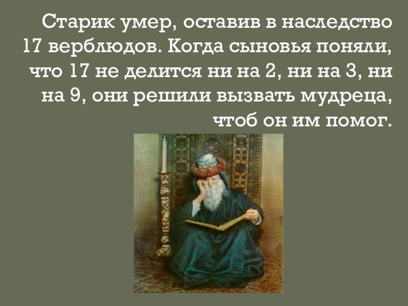 Слайд 16Старик умер, оставив в наследство 17 верблюдов. Когда сыновья поняли, что
