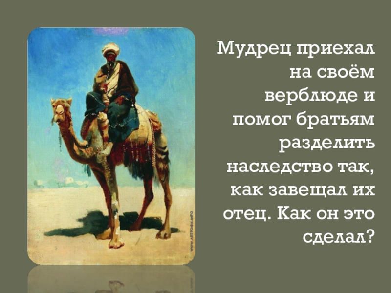 Слайд 17Мудрец приехал на своём верблюде и помог братьям разделить наследство так,