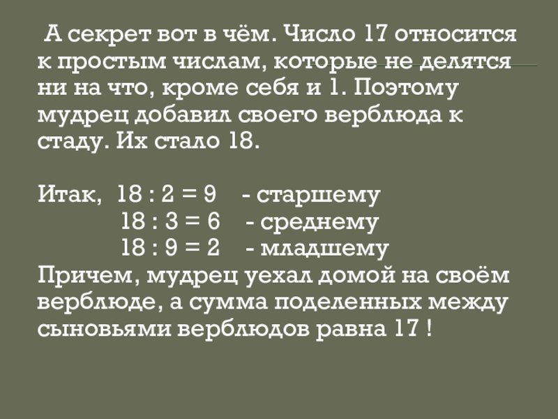 простым числам, которые не делятся ни на что, кроме себя и 1. Поэтому мудрец добавил своего верблюда к стаду. Их стало 18.