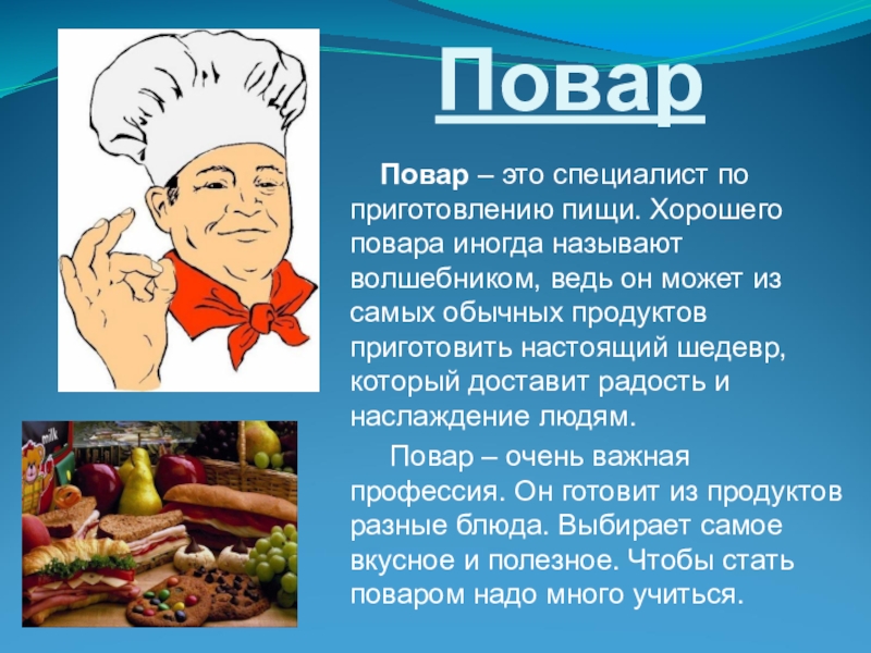 Повар – очень важная профессия. Он готовит из продуктов разные блюда. Выбирает самое вкусное и полезное. Чтобы стать поваром надо много учиться.
