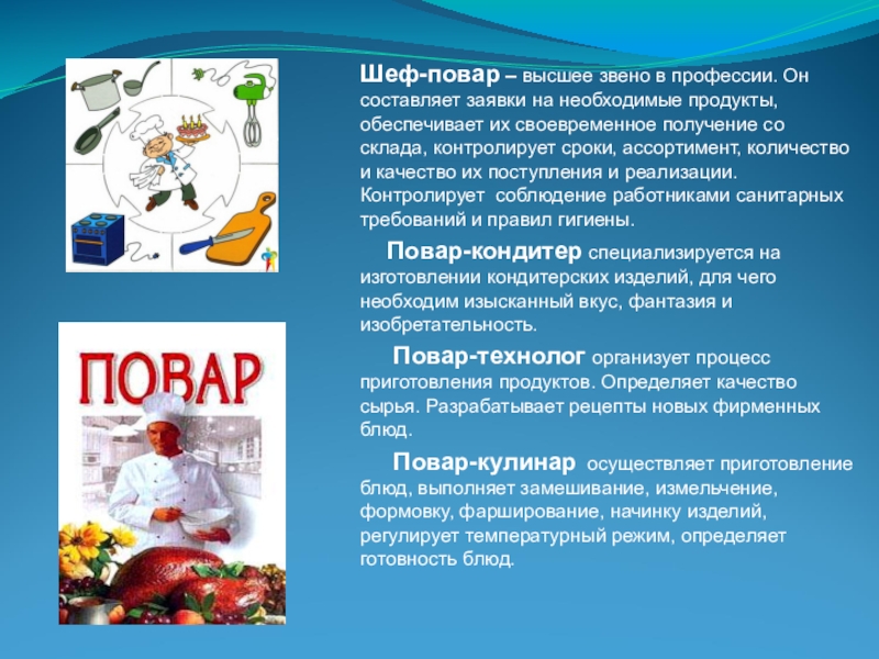 Слайд 5Шеф-повар – высшее звено в профессии. Он составляет заявки на необходимые продукты, обеспечивает