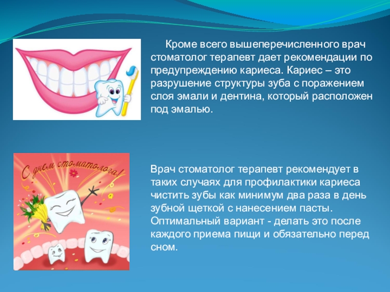 Слайд 9 Кроме всего вышеперечисленного врач стоматолог терапевт дает рекомендации