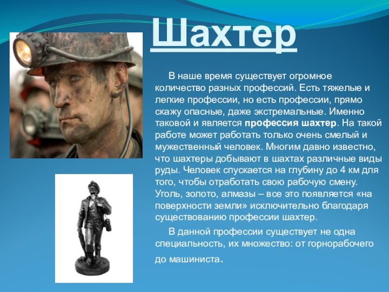 Слайд 11 Профессия шахтер из-за своей сложности требует от человека