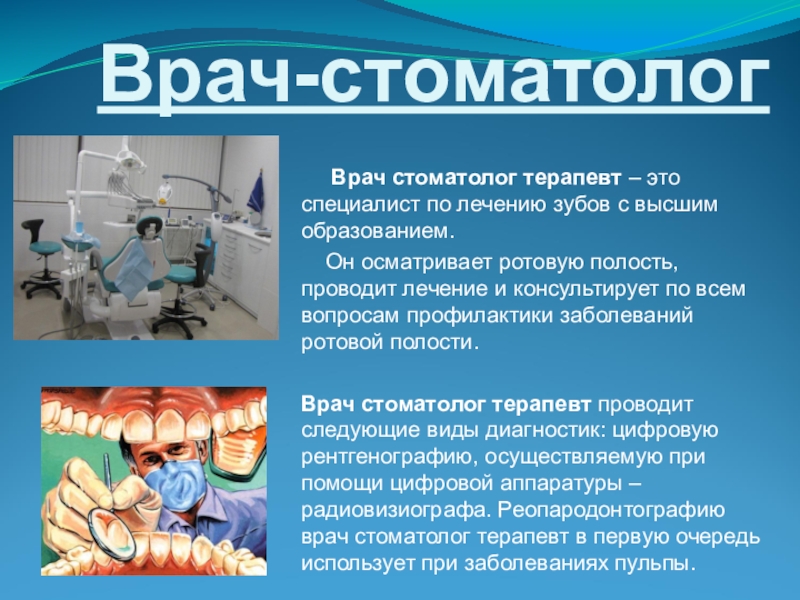 Он осматривает ротовую полость, проводит лечение и консультирует по всем вопросам профилактики заболеваний ротовой полости.