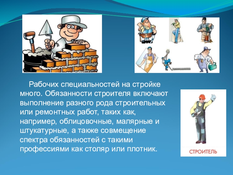 Слайд 3 Рабочих специальностей на стройке много. Обязанности строителя включают