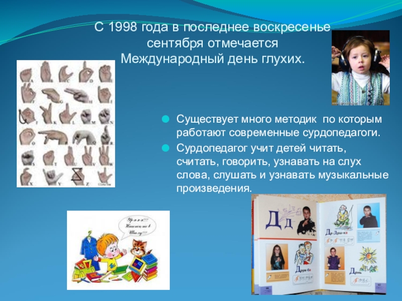 Сурдопедагог учит детей читать, считать, говорить, узнавать на слух слова, слушать и узнавать музыкальные произведения.