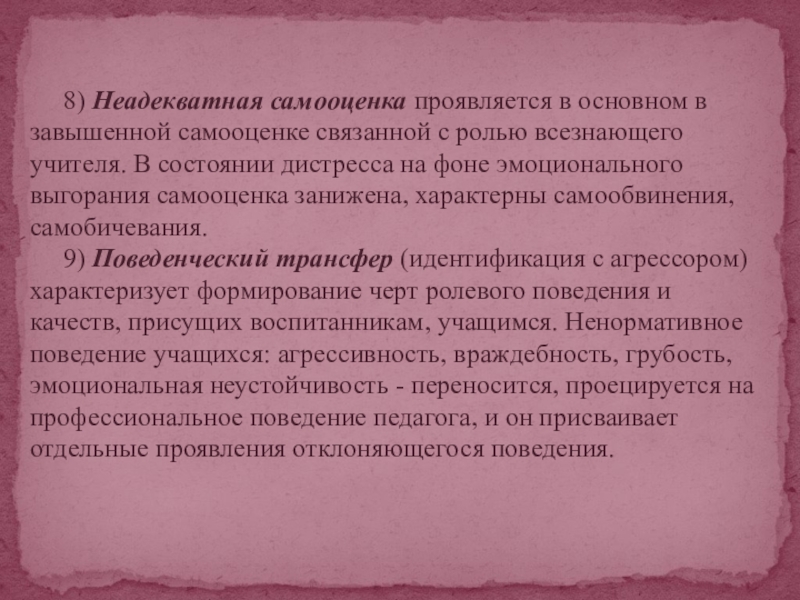 с ролью всезнающего учителя. В состоянии дистресса на фоне эмоционального выгорания самооценка занижена, характерны самообвинения, самобичевания.