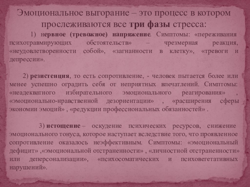 3) истощение – оскудение психических ресурсов, снижение эмоционального тонуса, которое наступает вследствие того, что проявленное сопротивление оказалось неэффективным. Симптомы: «эмоциональный дефицит» ,«эмоциональной отстраненности» , «личностной отстраненности» или деперсонализации», «психосоматических и психовегетативных нарушений».