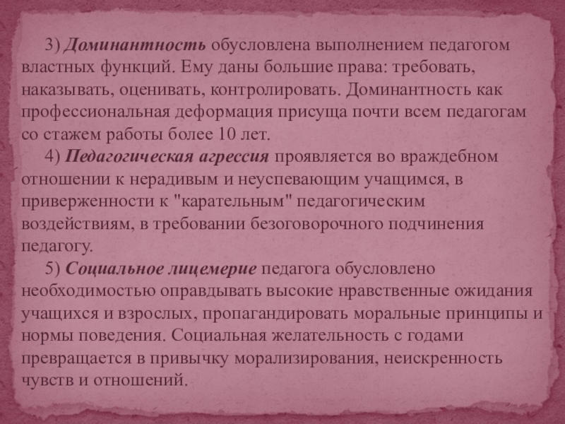 права: требовать, наказывать, оценивать, контролировать. Доминантность как профессиональная деформация присуща почти всем педагогам со стажем работы более 10 лет.