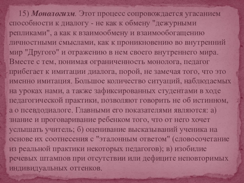 Слайд 15 15) Монологизм. Этот процесс сопровождается угасанием способности к диалогу -