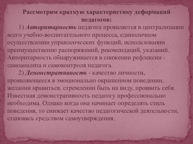 Слайд 8Рассмотрим краткую характеристику деформаций педагогов: