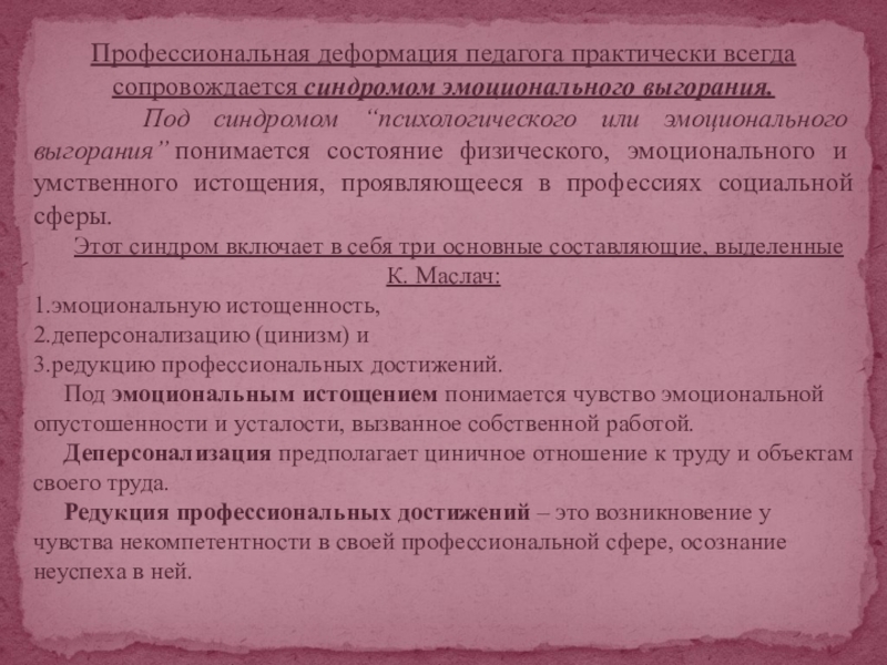 Слайд 1Понятия профессиональной деформации , деструкции и выгорания педагога. Виды. Профилактика.
