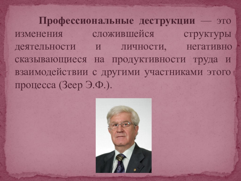 Слайд 2 Профессиональные деструкции — это изменения сложившейся структуры деятельности и