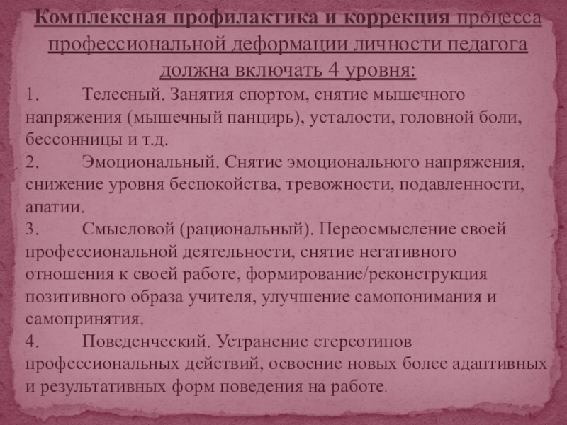 Слайд 21Комплексная профилактика и коррекция процесса профессиональной деформации личности педагога должна включать 4