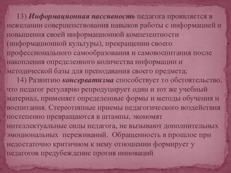 Слайд 14 13) Информационная пассивность педагога проявляется в нежелании совершенствования навыков работы
