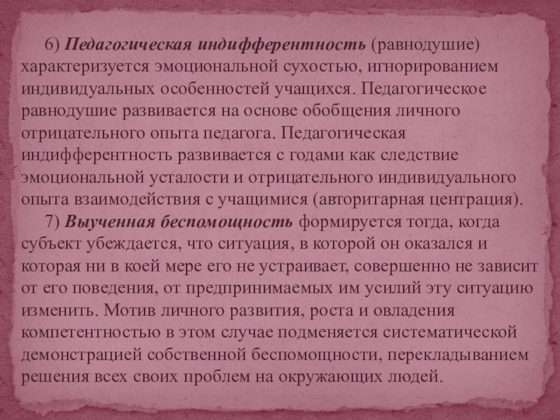 учащихся. Педагогическое равнодушие развивается на основе обобщения личного отрицательного опыта педагога. Педагогическая индифферентность развивается с годами как следствие эмоциональной усталости и отрицательного индивидуального опыта взаимодействия с учащимися (авторитарная центрация).
