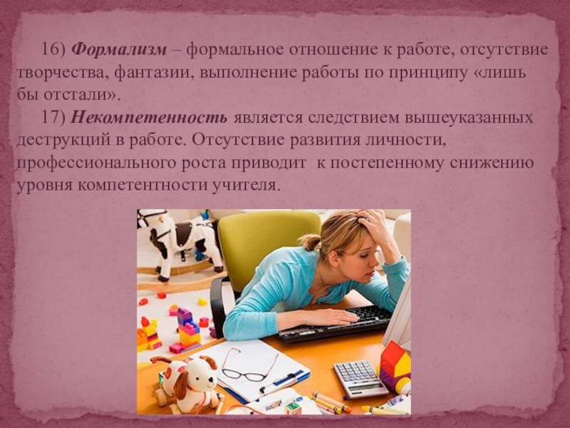 Слайд 16 16) Формализм – формальное отношение к работе, отсутствие творчества, фантазии,