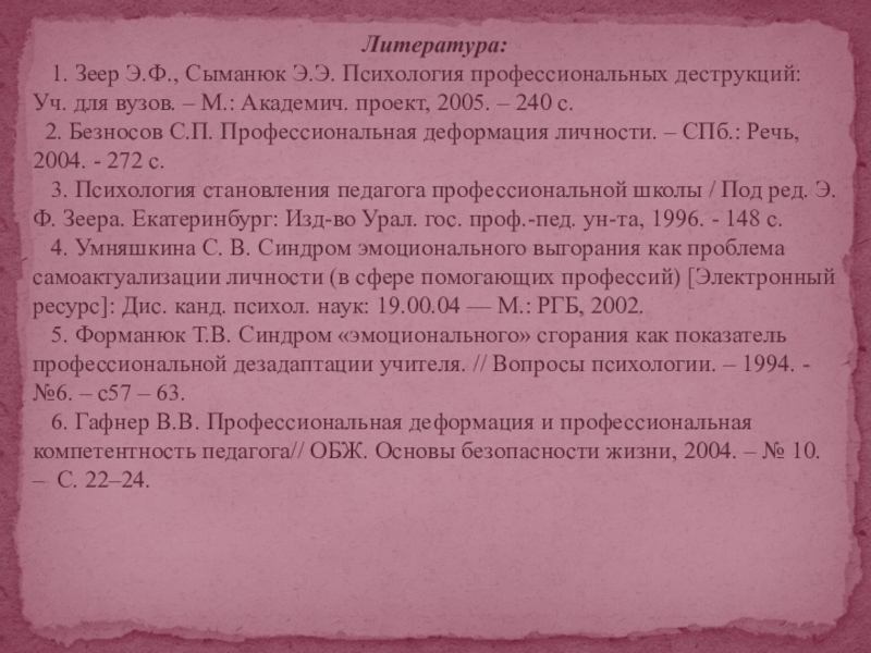 2. Безносов С.П. Профессиональная деформация личности. – СПб.: Речь, 2004. - 272 с.