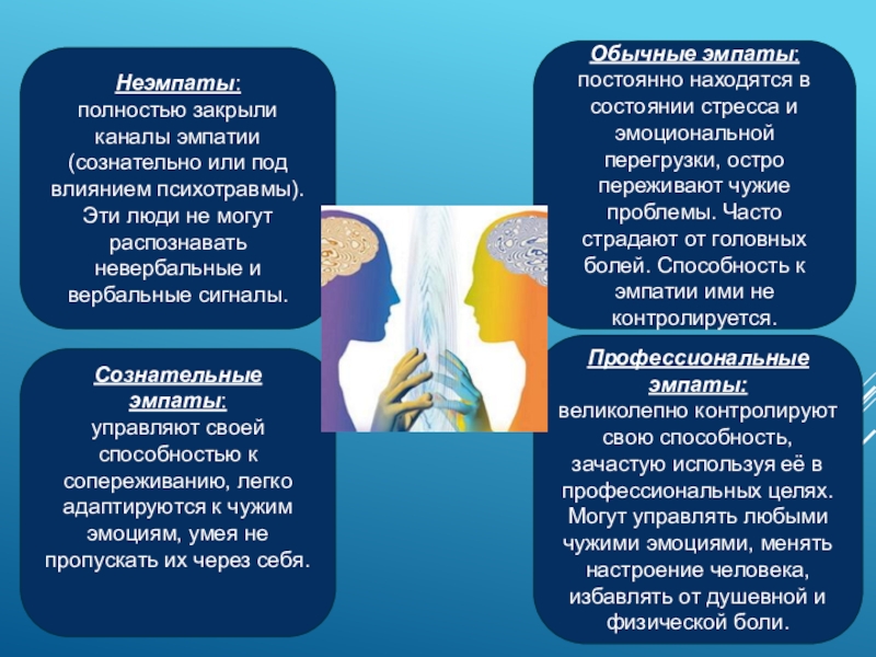 Обычные эмпаты: постоянно находятся в состоянии стресса и эмоциональной перегрузки, остро переживают чужие проблемы. Часто страдают от головных болей. Способность к эмпатии ими не контролируется.