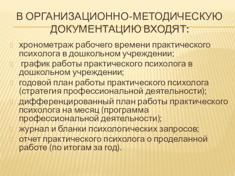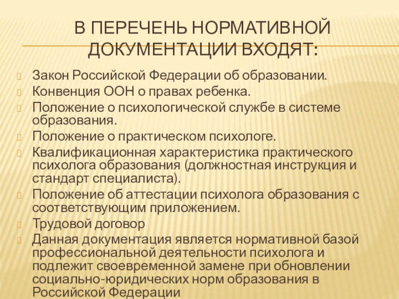 Данная документация является нормативной базой профессиональной деятельности психолога и подлежит своевременной замене при обновлении социально-юридических норм образования в Российской Федерации