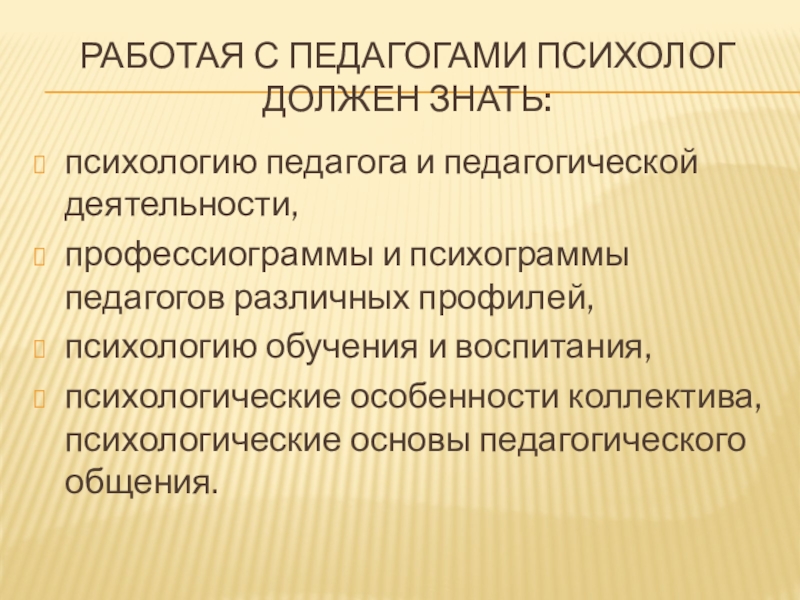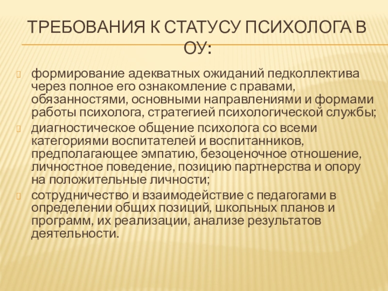 его ознакомление с правами, обязанностями, основными направлениями и формами работы психолога, стратегией психологической службы;