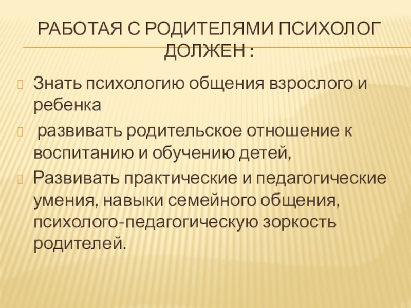 Развивать практические и педагогические умения, навыки семейного общения, психолого-педагогическую зоркость родителей.