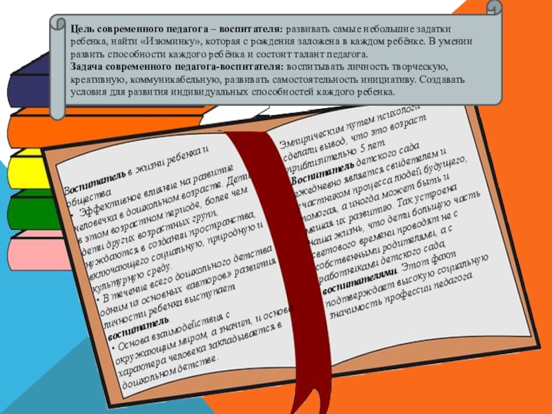 Цель современного педагога – воспитателя: развивать самые небольшие задатки ребенка, найти «Изюминку», которая с рождения заложена в каждом ребёнке. В умении развить способности каждого ребёнка и состоит талант педагога.