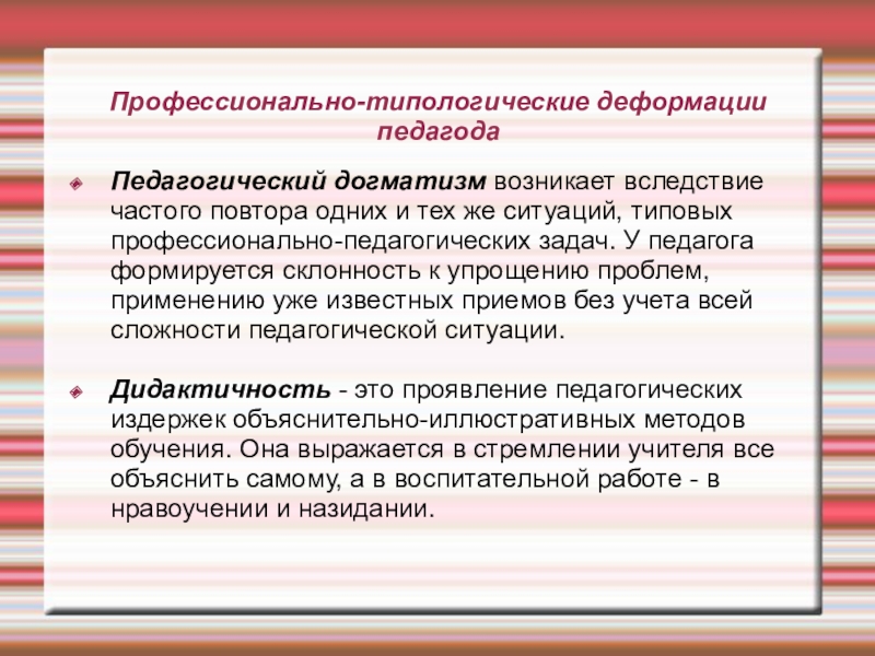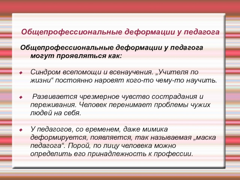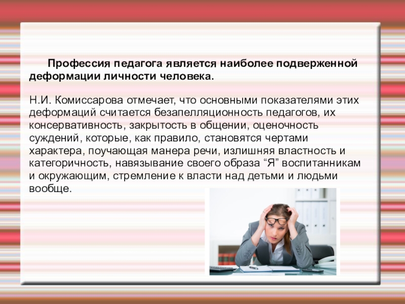 Слайд 23 Профессия педагога является наиболее подверженной деформации личности человека.