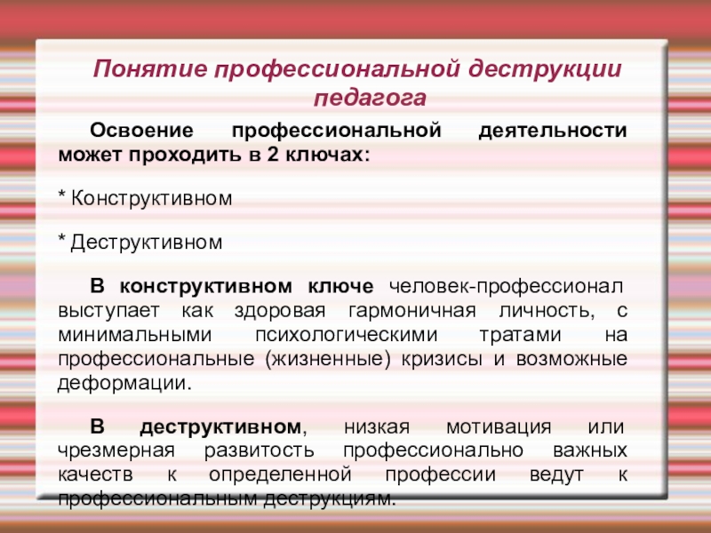 В конструктивном ключе человек-профессионал выступает как здоровая гармоничная личность, с минимальными психологическими тратами на профессиональные (жизненные) кризисы и возможные деформации.