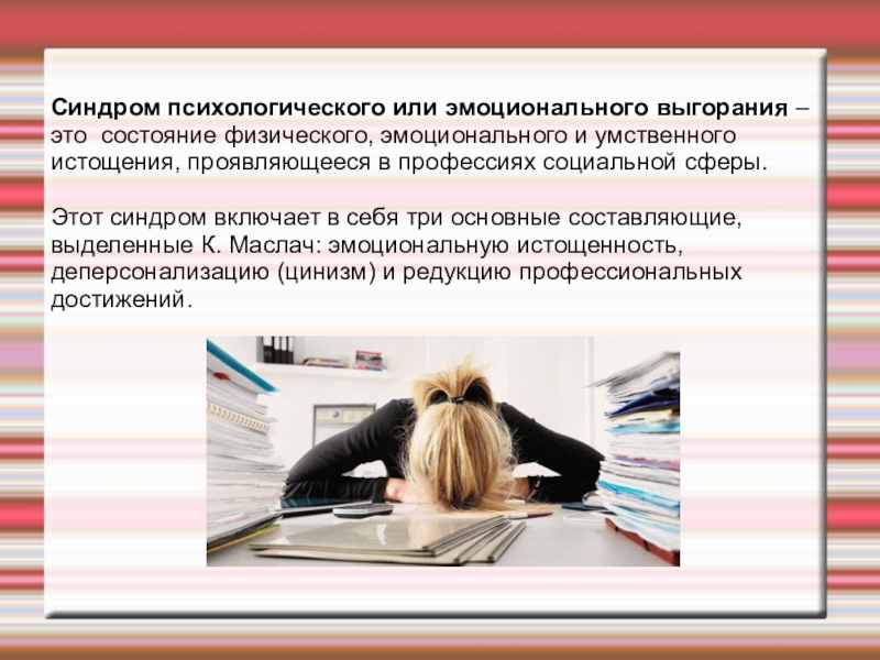 Слайд 26Синдром психологического или эмоционального выгорания – это состояние физического, эмоционального и