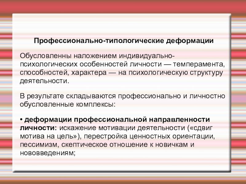 • деформации профессиональной направленности личности: искажение мотивации деятельности («сдвиг мотива на цель»), перестройка ценностных ориентации, пессимизм, скептическое отношение к новичкам и нововведениям;