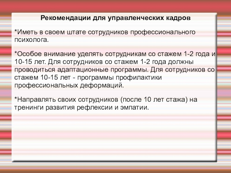 *Направлять своих сотрудников (после 10 лет стажа) на тренинги развития рефлексии и эмпатии.