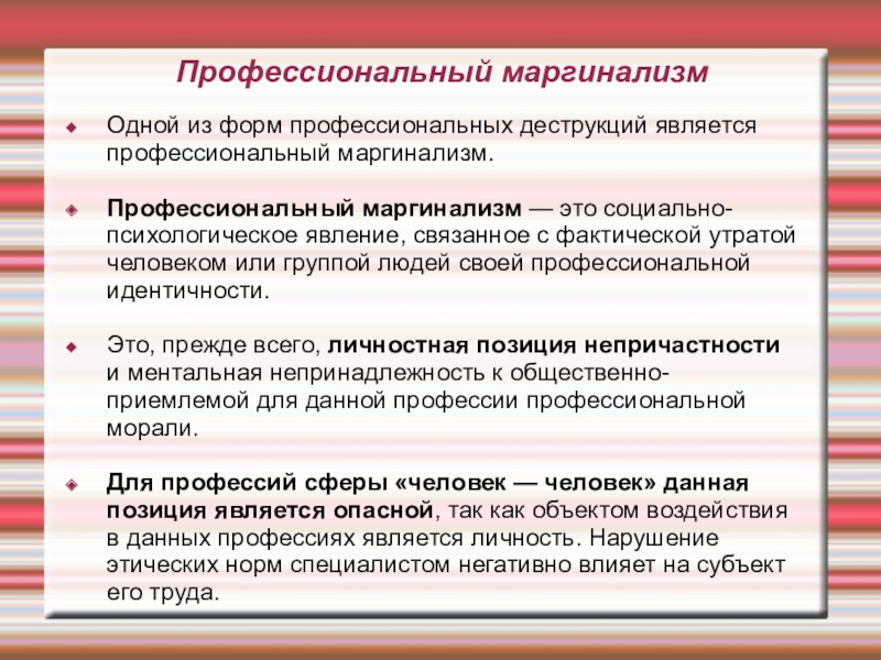 Одной из форм профессиональных деструкций является профессиональный маргинализм.