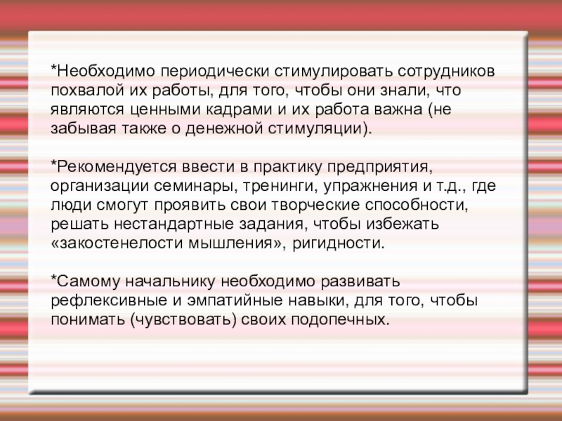 Слайд 31*Необходимо периодически стимулировать сотрудников похвалой их работы, для того, чтобы они